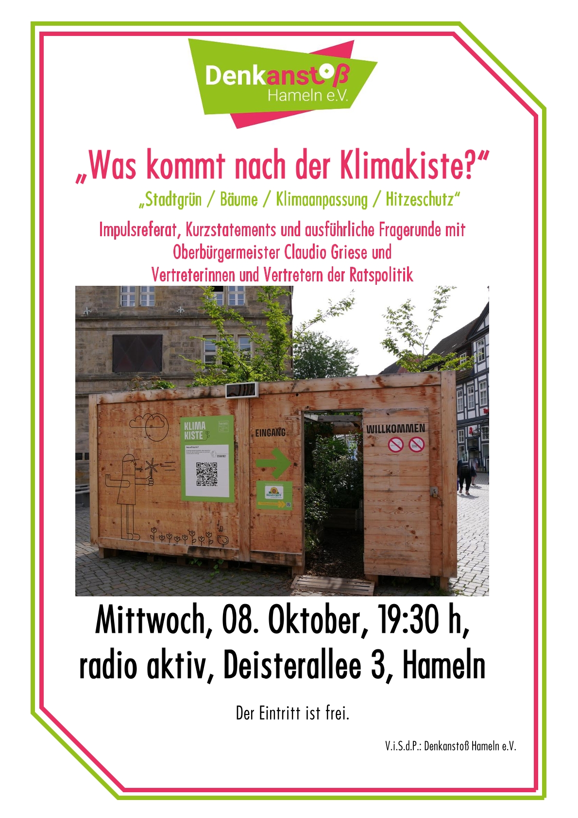 Unter dem Motto „Was kommt nach der Klimakiste?“ lädt der Verein Denkanstoß Hameln e.V. am Mittwoch, 8. Oktober, um 19.30 Uhr zu einem Zukunftsgespräch über Hitzeschutz und Stadtgrün in Hameln ein. Die Veranstaltung ist in den Räumlichkeiten von radio aktiv, Deisterallee 3.