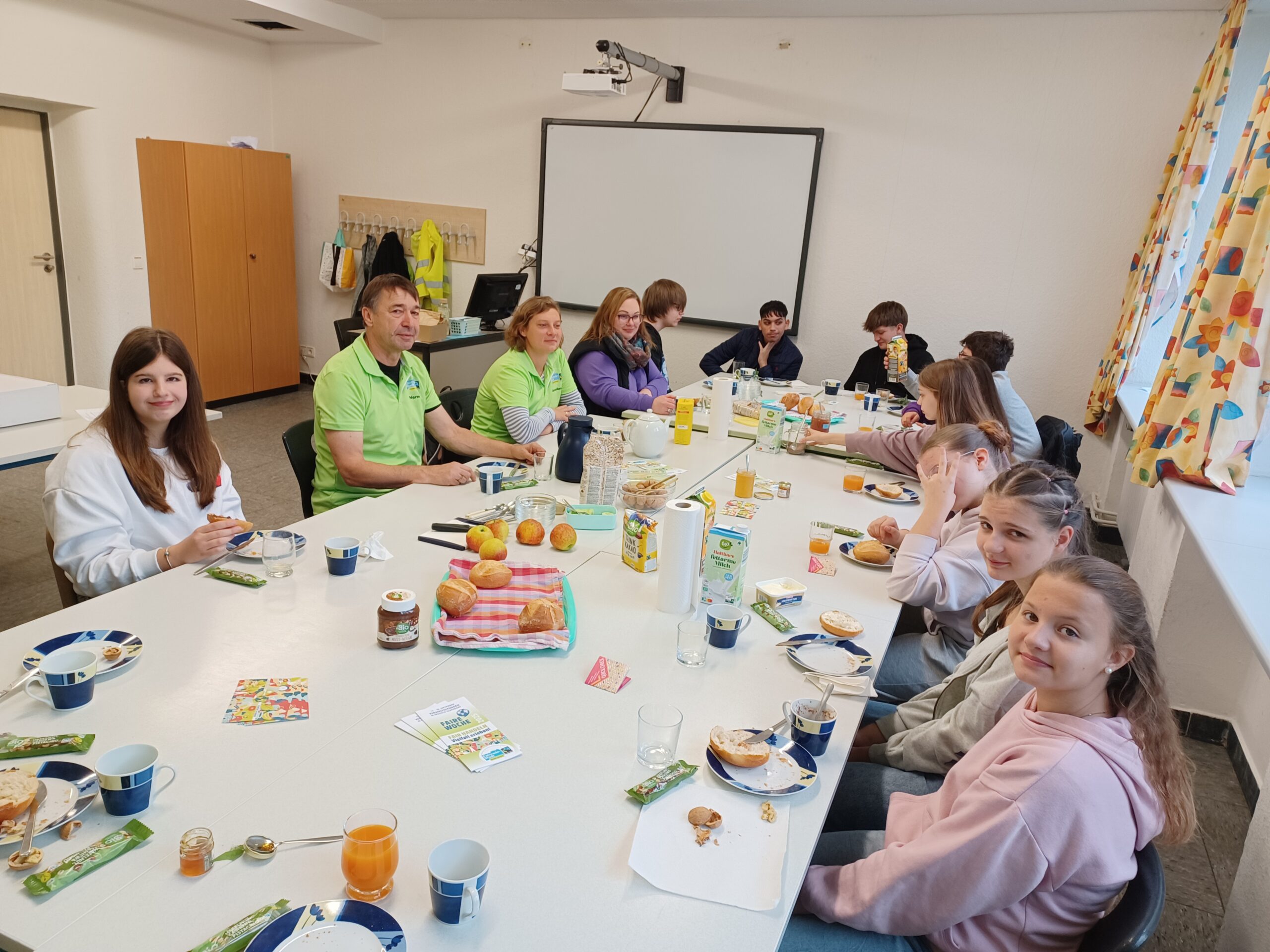 Foto: Peter Jahn – Anastasia Bost und Hermann Faust (grüne T-Shirts) beim Fairen Frühstück in der Oberschule