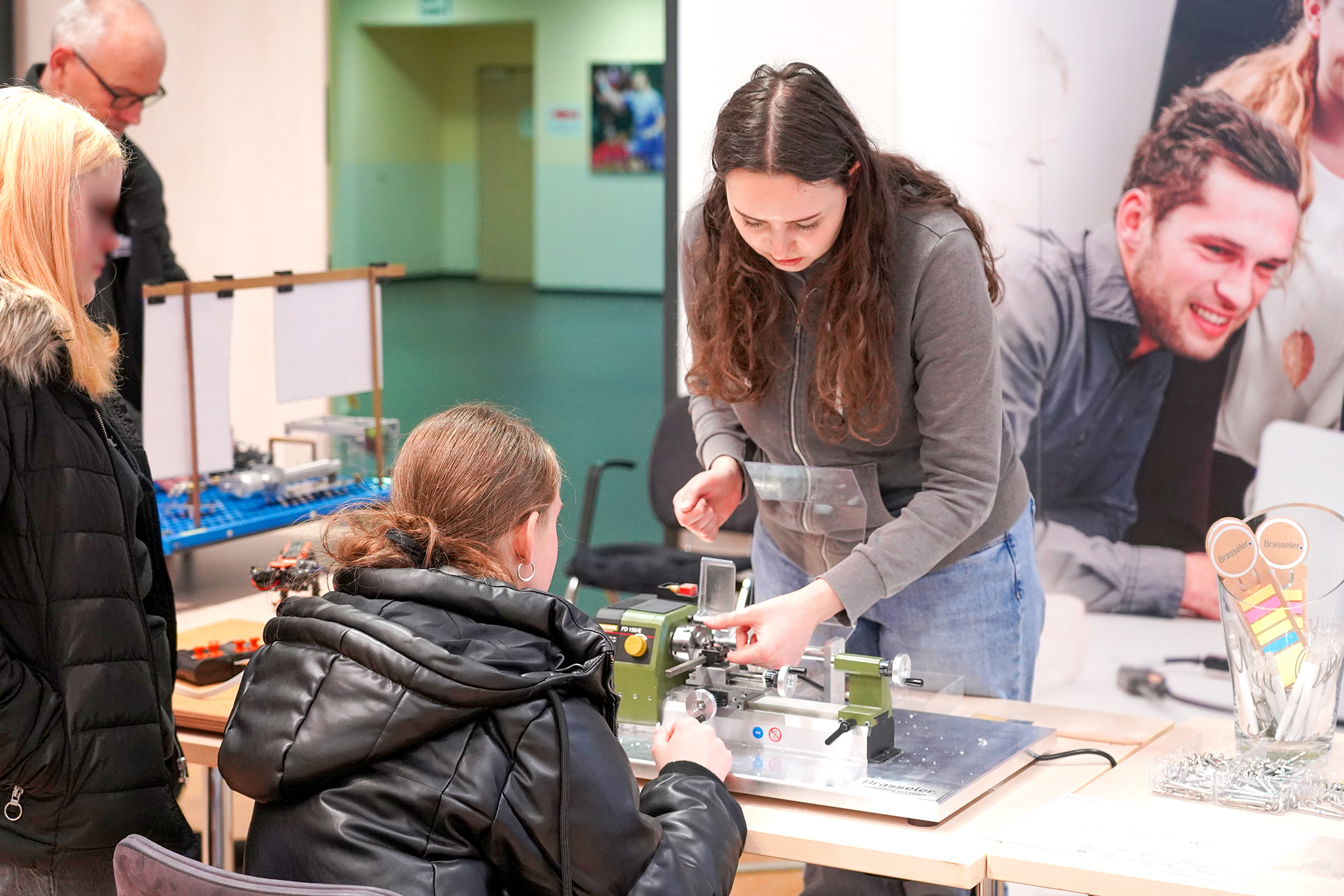 Bildunterschrift: Am Stand der Gebr. Brasseler GmbH & Co. KG wurde auf dem Lippe.MINT-Tag 2024 Metall mit einer Maschine bearbeitet.