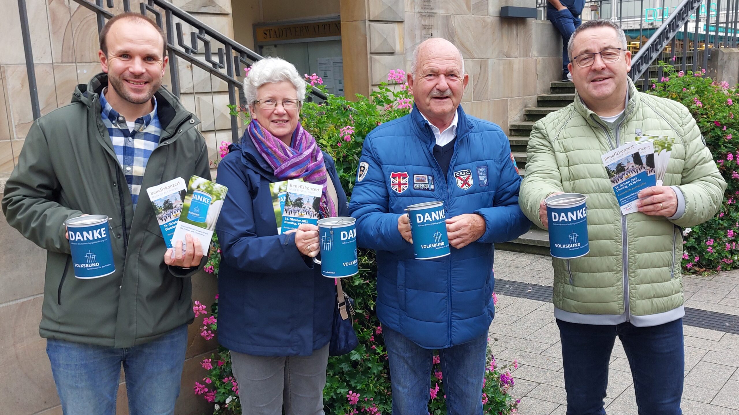FOTO: VOLKSBUND: (v.l.) Sebastian Schulz (Kreisgeschäftsführer Volksbund Lippe), Elke Wittek (3. Stv. Bürgermeisterin Stadt Detmold), Heinz Holey (Oberst Schützengesellschaft Detmold) und Dr. Axel Lehmann (Vorsitzender Volksbund Lippe) beim Auftakt der Sammlung für den Volksbund Deutsche Kriegsgräberfürsorge.