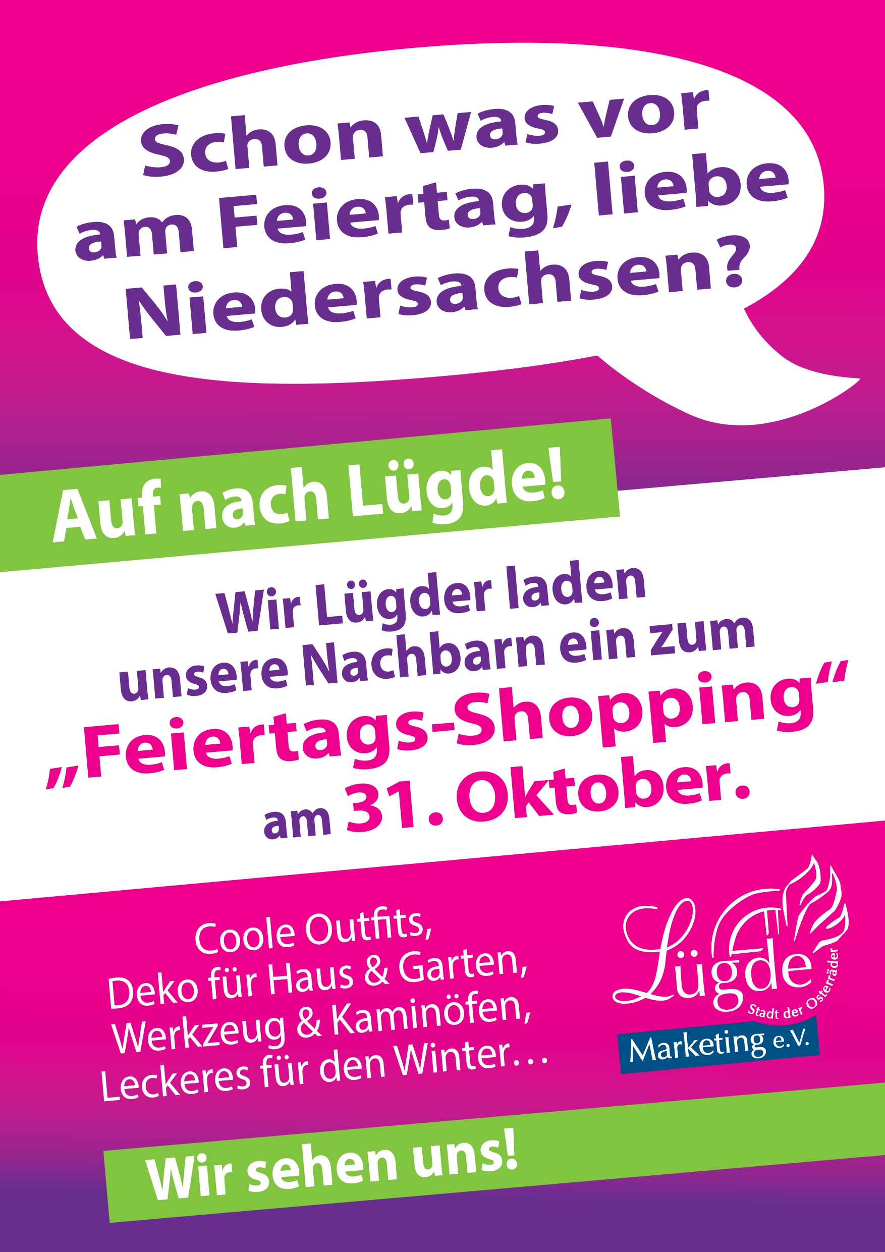 Seit 2018 ist der Reformationstag am 31. Oktober in Niedersachsen ein gesetzlicher Feiertag – die Geschäfte bleiben also geschlossen, so auch in Bad Pyrmont. Doch wer an diesem Tag nicht auf einen Einkaufsbummel verzichten möchte, findet direkt nebenan eine Gelegenheit: In Lügde (NRW) sind die Geschäfte heute, am 31. Oktober, ganz regulär geöffnet. Und schon morgen heißt es dann: Rollentausch! Denn am 1. November (Allerheiligen) ist in NRW gesetzlicher Feiertag. Während die Lügder Geschäfte geschlossen bleiben, können die Einwohnerinnen und Einwohner aus NRW den freien Tag nutzen, um in Bad Pyrmont und Umgebung durch die niedersächsische Geschäftswelt zu bummeln. So wird das Feiertagswochenende mit gelebter Nachbarschaft ein grenzenloses Einkaufsvergnügen.