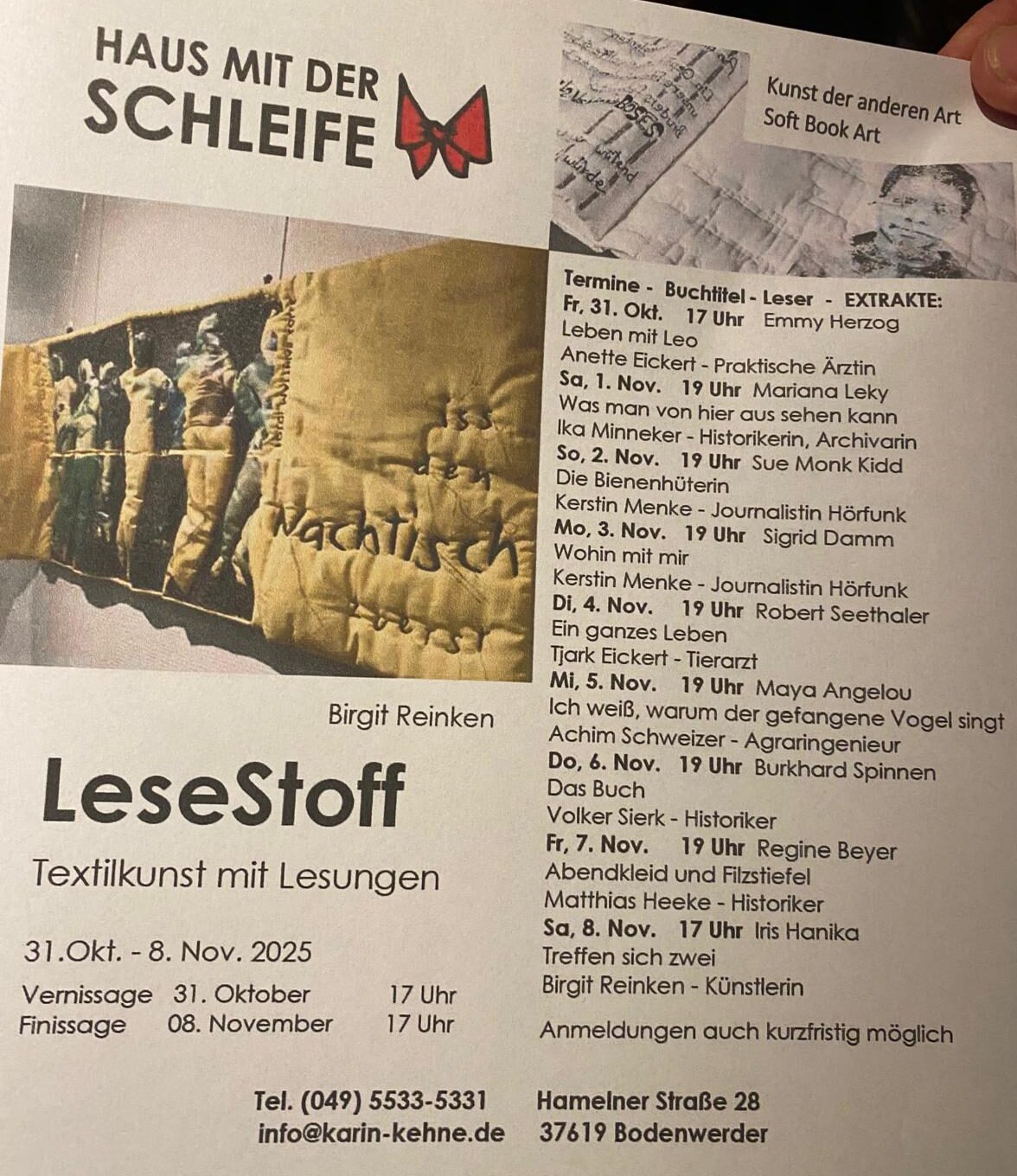 Wie nah kommen wir an das heran, was wir lesen? Die Künstlerin Birgit Reinken extrahiert weiche Varianten von Textauszügen aus Büchern. Tägliche Lesungen und Kunstausstellung vom 31. Oktober bis 9. November ab 19 Uhr. Finissage: 8. November, 17 Uhr. Der Eintritt ist frei. Um Anmeldung wird gebeten: