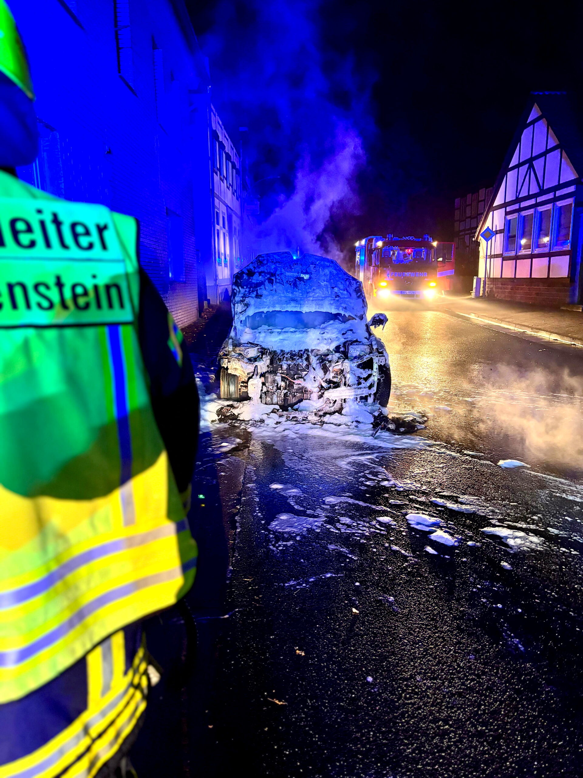 Im Flecken Salzhemmendorf ist die Feuerwehr kurz vor Mitternacht (23:45 Uhr) zu einem PKW-Brand in Lauenstein alarmiert worden. Beim Eintreffen der ersten Einsatzkräfte stand der Motorraum des Fahrzeugs, dass in der Straße „Im Flecken“ geparkt war, in Flammen. Zwei Trupps unter Atemschutz bekämpften die Flammen mit Wasser und Schaum. Durch die enorme Hitze des Feuers platzten beide Vorderreifen, was zu sehr lauten Explosionsgeräuschen führte. Die Feuerwehrleute bekämpften den Brand kurzzeitig aus der Deckung heraus. Nach kurzer Zeit hatten die rund 40 Einsatzkräfte den Brand unter Kontrolle und konnten den Einsatz nach etwa einer Stunde beenden. Beim PKW ist von einem Totalschaden auszugehen. Auch die Fensterscheibe eines angrenzenden Wohnhauses wurde durch die extreme Hitze beschädigt, ebenso der Asphalt. Warum das Auto in Brand geraten ist, ist noch unklar. Die Polizei hat Ermittlungen aufgenommen. Hinweise möglicher Zeugen nimmt die Dienststelle in Bad Münder entgegen.