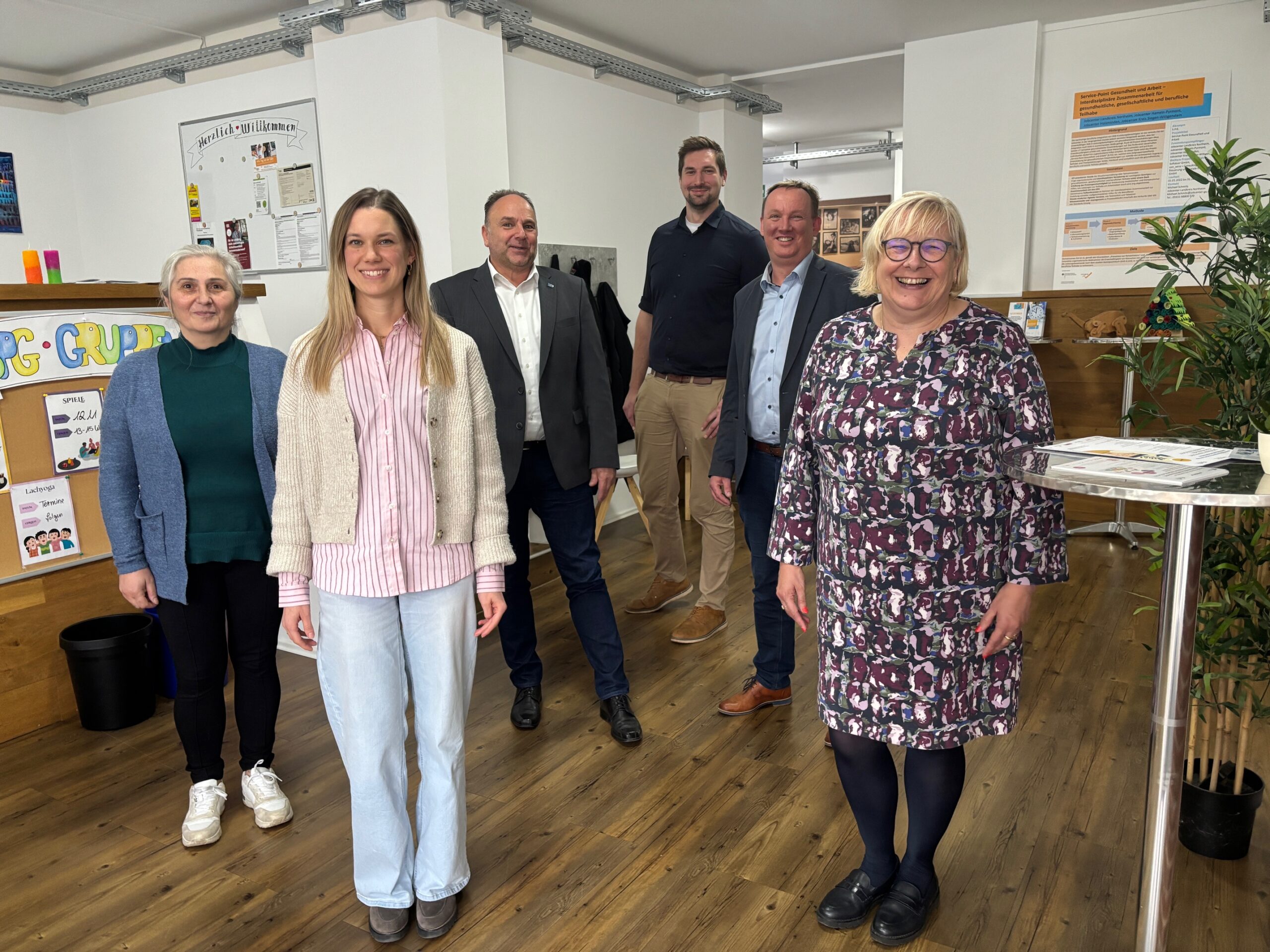 Foto (Peter Drews/Landkreis Holzminden): v. l. Esma Vurgun (Fallmanagement rehapro), Sina Gröne (stellv. Projektkoordinatorin/Fallmanagement rehapro), Landrat Michael Schünemann, Simon Jonski (Projektkoordinator Softdoor), Michael Namislo (Jobcenter/Teamleiter rehapro) und Marie-Luise Niegel (Geschäftsführerin Jobcenter)