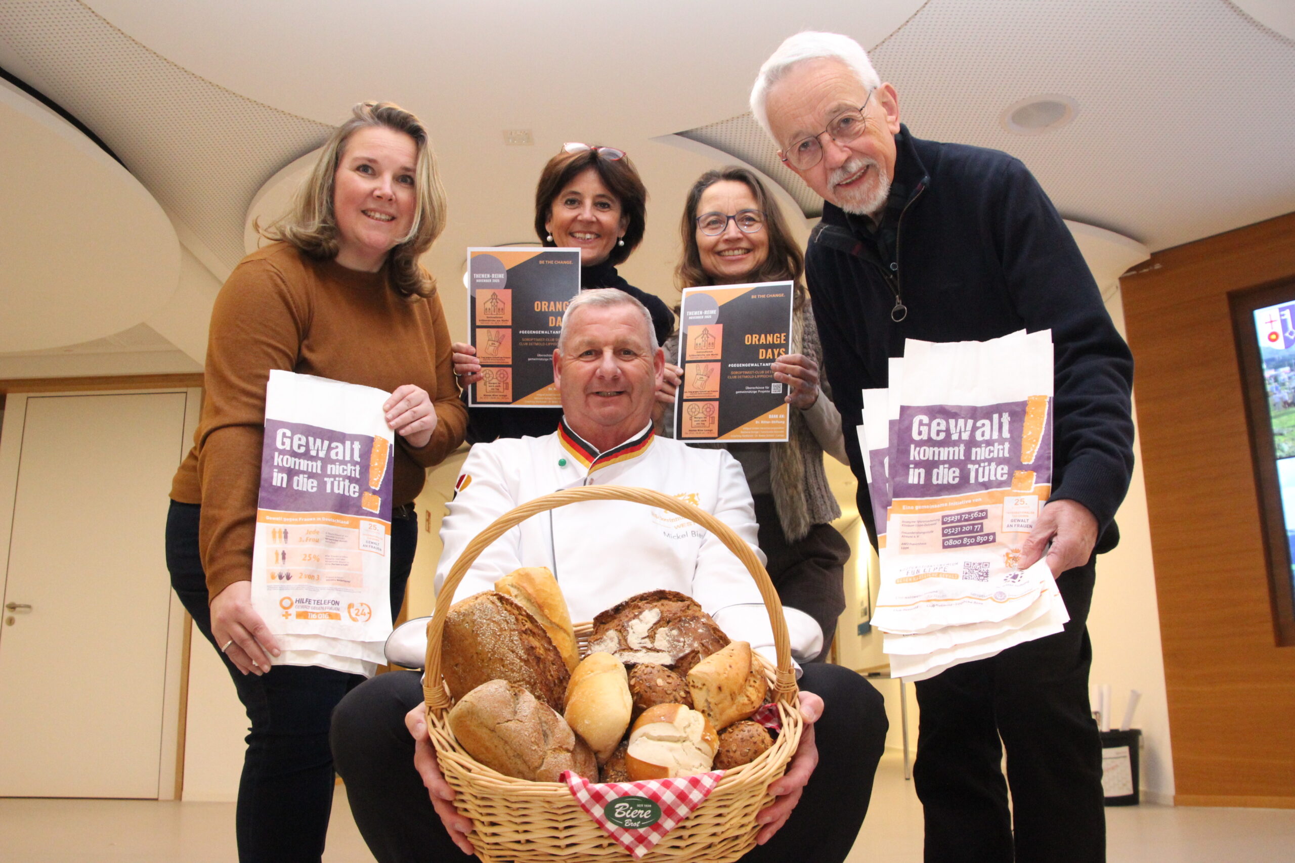 Foto (Kreis Lippe): Mickel Biere von der Bäcker-Innung der Kreishandwerkerschaft Paderborn-Lippe (vorne mit Brötchenkorb), Gleichstellungsbeauftragte Nicole Krüger (von links nach rechts), Stefani Quentell (Soroptimist-Club Detmold), Christiane Nitschke (Soroptimist-Club Detmold-Lippische Rose) und Günter Kuhlemann (Dr. Ritter-Stiftung) setzen ein Zeichen gegen häusliche Gewalt.