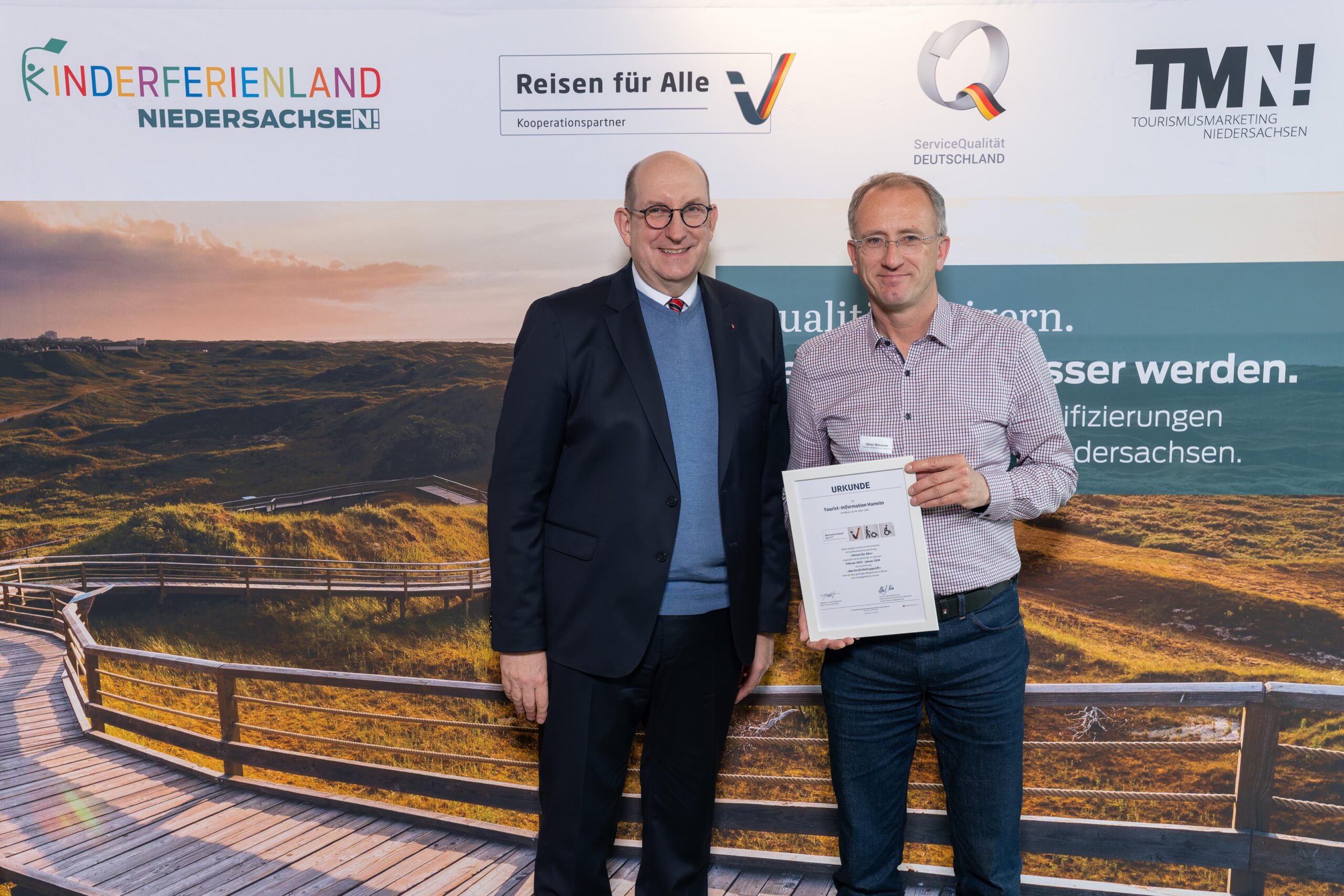 Die Hameln Marketing und Tourismus GmbH ist mit dem Zertifikat „Reisen für Alle“ ausgezeichnet worden. Das Reisen für Alle-Logo signalisiert, dass ein Betrieb Barrierefreiheit bieten kann. Innerhalb des Betriebes der HMT wurde die Touristinformation erstmals ausgezeichnet. Neben der Rattenfänger-Halle und dem Weserbergland-Zentrum ist das die dritte Auszeichnung für das Unternehmen. Insgesamt wurden rund 60 Qualitätszertifikate jetzt (Fr.) im Rahmen einer Feierstunde vom Niedersächsischen Staatssekretär aus dem Ministerium für Wirtschaft, Verkehr und Bauen, Matthias Wunderling-Weilbier, an Betriebe und Anbieter touristischer Dienstleistungen vergeben. Mit den Initiativen Kinderferienland Niedersachsen, ServiceQualität Deutschland und Reisen für Alle will die Landesregierung zur nachhaltigen Verbesserung und Stärkung der Qualität im Niedersachsentourismus beitragen.