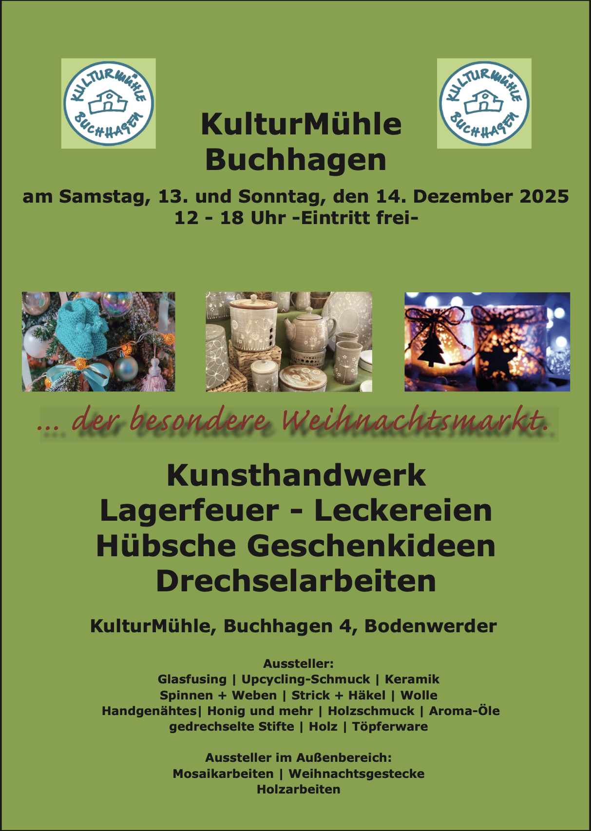 An diesem Wochenende lädt die KulturMühle Buchhagen zum „Adventsbasar WeihnachtsZauber“ ein. Es gibt verschiedenen Stände mit Kunsthandwerk sowie kulinarischen Angeboten, sagt Simone Kelly, Geschäftsführerin des Vereins Kaleidoskop. Der Adventsbasar in der KulturMühle Buchhagen ist am Samstag und Sonntag (13. und 14. Dezember) jeweils von 12 und 18 Uhr geöffnet. Der Eintritt ist frei.