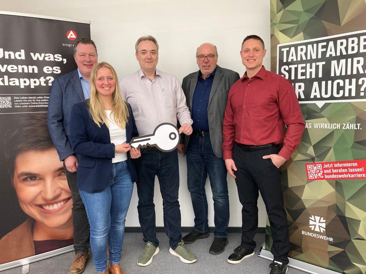 Die Bundeswehr bietet ab März regelmäßige Karriereberatungen in der Agentur für Arbeit in Hameln an. Interessierte aus dem Landkreis Hameln-Pyrmont können so wohnortnah eine direkte und persönliche Beratung zu den Karrieremöglichkeiten der Bundeswehr erhalten. Das Beratungsangebot richtet sich an Schulabgänger, Berufserfahrene und Quereinsteiger. Termine können ab sofort online gebucht werden, sagte Simone Förster, die in der Arbeitsagentur Hameln die Zusammenarbeit mit der Bundeswehr koordiniert, bei der symbolischen Schlüsselübergabe für das Beratungsbüro. Die Bundeswehr biete mit 50 Ausbildungsberufen und über 30 Studiengängen im zivilen und militärischen Bereich vielfältige Möglichkeiten, sagt Oliver-Patrick Spaks, der als Karriereberater der Bundeswehr die Gespräche zukünftig führen wird. Auch Praktikumsmöglichkeiten und die Vermittlung von Truppenbesuchen gehören zum Portfolio. Termine im Karriereberatungsbüro der Bundeswehr können über die Internetseite der Bundeswehr unter www.bundeswehrkarriere.de/dialog/beratung-kontakt/beratungsgespraech gebucht werden.