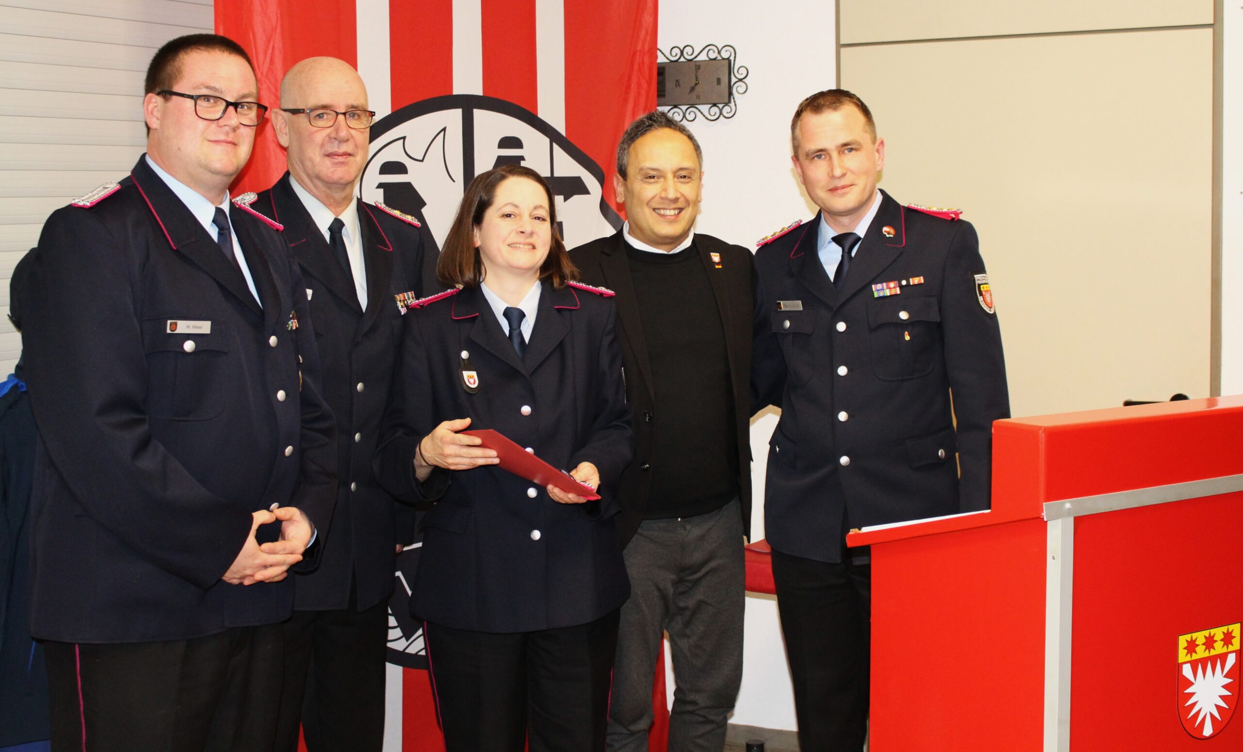 Bild: Die beförderten Funktionsträger des Stadtkommandos: Julia Martens mit Marco Meier (v.li.), Jürgen Battermann, Bürgermeister Tarik Oenelcin und Stadtbrandmeister Tobias Ebbighausen. Foto Peter Jahn