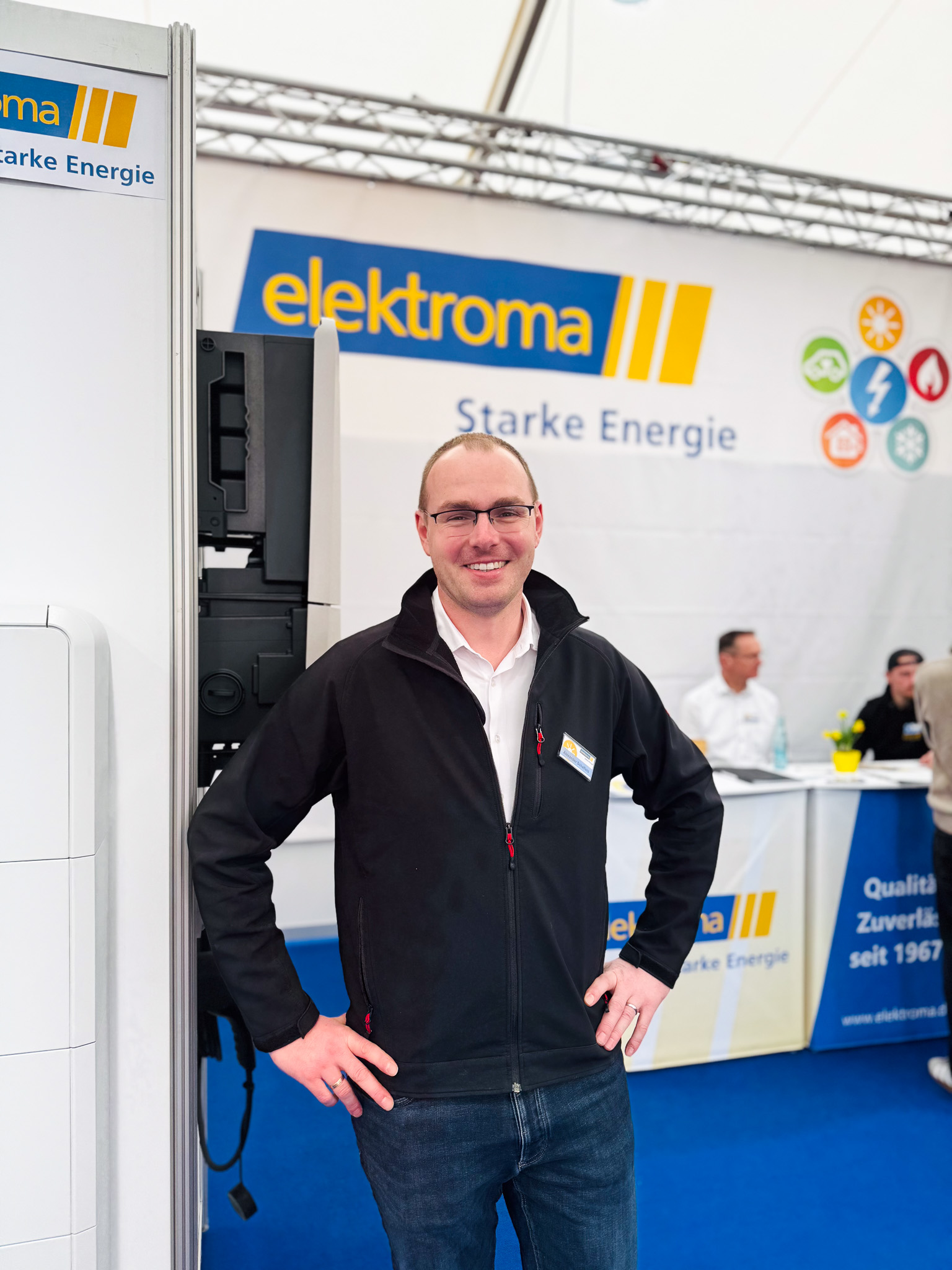 Michel Oeler im Gespräch mit Alexander Schaffeld von der Firma elektroma GmbH auf der Messe „Haus und Energie“ in Hameln.