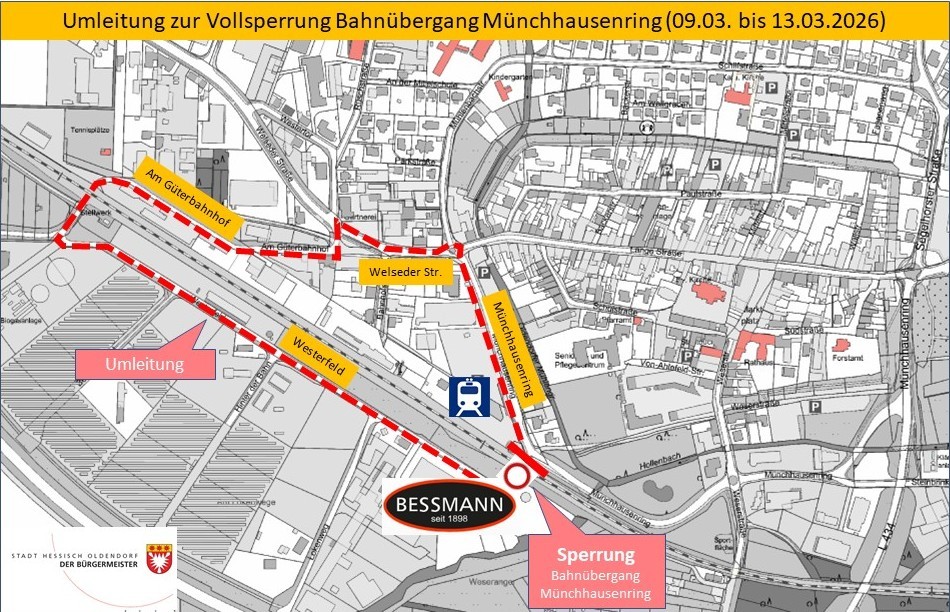 In dieser Woche (09.03. – 13.03.2026) erfolgt die bereits angekündigte Sperrung der Bahnübergänge „Weserstraße“ und „Münchhausenstraße“. Der Bereich hinter dem Bahnübergang „Weserstraße“ (inkl. der Grundstücke „Weserstraße 38 und 38 A“) kann alternativ über den Wirtschaftsweg erreicht werden, der von der L 434 (Richtung Fuhlen) abzweigt, während der Bereich hinter dem Bahnübergang „Münchhausenstraße“ (inkl. Bessmann) alternativ über den Bahnübergang „Am Güterbahnhof“ erreicht werden kann.