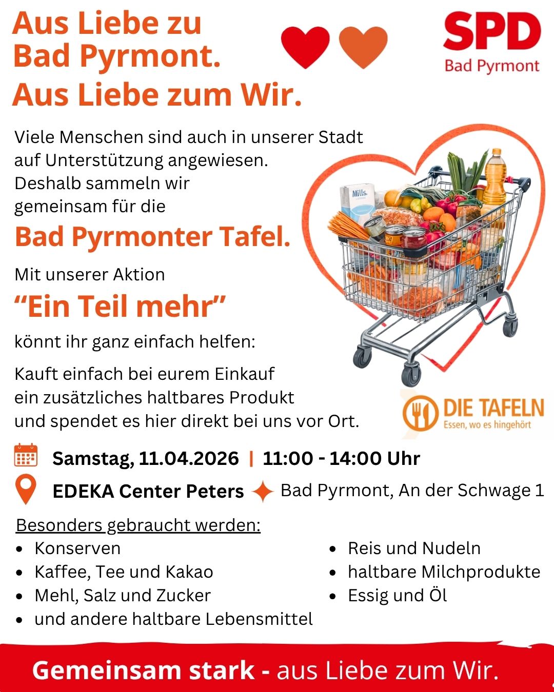 Unter dem Motto „Ein Teil mehr“ ruft die SPD Bad Pyrmont heute zu einer Spendenaktion für die Bad Pyrmonter Tafel auf.