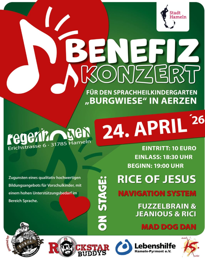 RICE OF JESUS, Fuzzelbrain, MAD DOG DAN und weitere lokale Bekanntheiten der Musikbranche treten am Freitag für den guten Zweck im Regenbogen auf. Zum Benefizkonzert für den Sprachheilkindergarten „Burgwiese“ in Aerzen…
