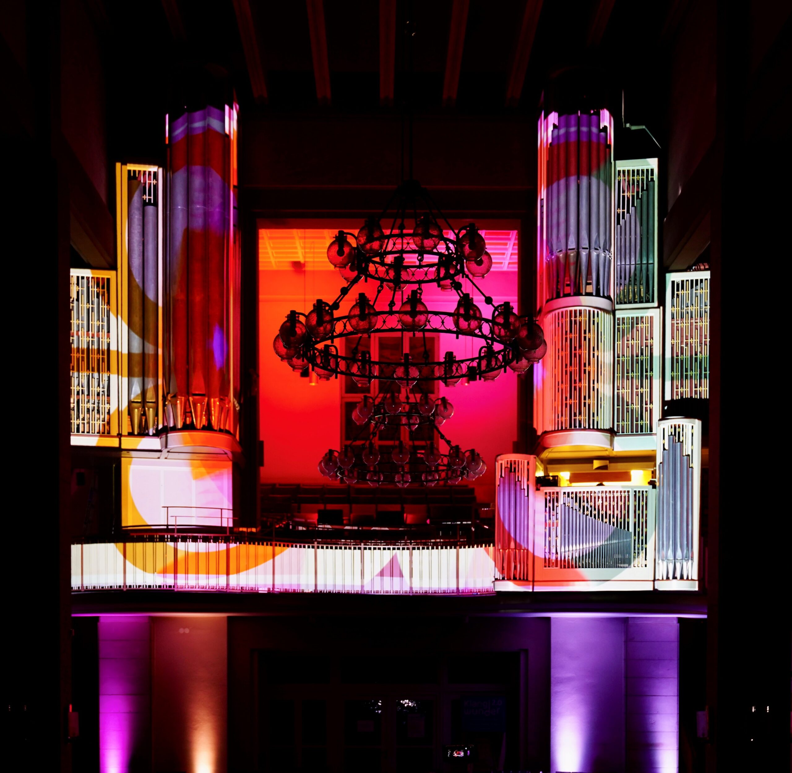 Bild: Beckerath-Goll-Orgel der Marktkirche St. Nicolai Hameln, farbig illuminiert. (Fotograf: Jens Riesener)