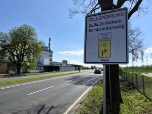 Spezialisten des Kampfmittelbeseitigungsdienstes Niedersachsen (KBD) werden am Sonntag, dem 26. April, auf dem BHW-Gelände an der Springer Landstraße in Hameln eine Fliegerbombe aus dem Zweiten Weltkrieg entschärfen. An diesem Tag wird es zu erheblichen Einschränkungen im Verkehr kommen, auch über das Evakuierungsgebiet hinaus. Die Stadt Hameln hat jetzt Informationen zu Straßensperrungen während der Bombenentschärfung am Sonntag veröffentlicht. Ab 6 Uhr morgens wird die B 1 im Stadtgebiet voll gesperrt – betroffen ist der Abschnitt vom Ortseingang Afferde bis zur Kreuzung Hastenbecker Weg/Tunnelstraße. Der Verkehr wird ab Bessingen über Bisperode und Voremberg bis zum Tündernschen Bahnhof umgeleitet und führt am Südbad wieder in die Stadt. Auch die Ortsdurchfahrt B 217 kann ab 6 Uhr nicht mehr befahren werden. In Fahrtrichtung Hameln wird die Straße kurz vor der Abfahrt ins Hottenbergsfeld gesperrt. Stadtauswärts ist auf Höhe Basbergstraße Schluss. Hier führt die Umleitungsstrecke ab Hasperde über Unsen und Holtensen zum Reimerdeskamp. Alle Umleitungen sind ausgeschildert. Die Sperrungen können erst nach erfolgreicher Entschärfung wieder freigegeben werden. Aktuelle Verkehrsinformationen, auch zu eventuellen Verzögerungen und zur Freigabe der Strecken, liefern am Evakuierungstag die Warn-Apps NINA und KATWARN, Verkehrs- und Navigationsdienste wie Google Maps, lokale Medien sowie die Stadt Hameln über ihre Social-Media-Kanäle. radio aktiv informiert am Sonntag ab 06.00 Uhr in einer Sondersendung live über die aktuellen Entwicklungen.