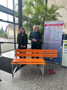 Zum Internationalen Tag gegen Gewalt an Frauen haben Landrat Dirk Adomat und die Gleichstellungsbeauftragte Kirsten Wente im Foyer des Kreishauses in Hameln eine orangefarbene Bank aufgestellt. Die Bank verfügt über zwei Sitzflächen, die Rückenlehne ist jedoch für drei Personen ausgelegt – ein Platz bleibt bewusst frei. Dieses freie Sitzpolster soll symbolisieren, dass es keinen Platz für häusliche Gewalt geben darf. Das Orange dieser Bank soll eine hellere, harmonischere Zukunft symbolisieren. Bis dahin ist es aber noch ein weiter Weg, wenn man sich die Zahlen anschaut, sagt Landrat Dirk Adomat. Foto Landkreis Hameln-Pyrmont