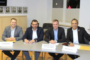 Die Stadtverwaltung Hessisch Oldendorf hat der Politik im Finanzausschuss ihren Haushaltsentwurf für das kommende Jahr vorgelegt. Trotz des Ausgangspunkts mit einem Defizit von vier Millionen Euro sei es gelungen einen Haushalt für 2026 ohne Steuererhöhung und mit einer schwarzen Null am Ende aufzustellen, teilt Bürgermeister Tarik Oenelcin mit. Der Entwurf geht jetzt in die Fraktionen, die ihre Wünsche und Forderungen einarbeiten, um dann gemeinsam mit der Stadtverwaltung am Mittwoch, 26. November, den Entwurf anzupassen, über den der Stadtrat entscheiden wird. Fest steht dabei, dass im kommenden Jahr bei den Investitionen das Ganztagsangebot an den Grundschulen im Vordergrund stehen soll. Rund 40 Prozent der Investitionen entfallen auf den Bereich Bildung. Das Haushaltsvolumen wächst von 39,9 Millionen Euro im laufenden Jahr auf 43,5 Millionen im Jahr 2026. Die Steuerhebesätze bleiben unverändert. Kalkuliert hat die Stadtverwaltung mit Einkommensteueranteilen von 11,23 Millionen Euro, Gewerbesteuereinnahmen von 7,8 Millionen Euro und Grundsteuererträgen B von 2,085 Millionen Euro. Hinzu kommen Schlüsselzuweisungen von rund 9,3 Millionen und laufende Landeszuweisungen von etwa 3,35 Millionen Euro. Bei den Ausgaben stehen die Personalaufwendungen mit 16,96 Millionen Euro oben an. Allein diese Aufwendungen und die Transferaufwendungen machen 72 Prozent des Aufwandes aus, rechnet man Abschreibungen und Zinsen hinzu, bleiben nur noch rund neun Millionen für die Bewirtschaftung kommunaler Liegenschaften, für Straßen, den Betrieb der Kindertagesstätten, für Feuerwehr, Schwimmbad, Jugendarbeit, Kultur, Bücherei und alles andere übrig. Foto von Peter Jahn: Von rechts – Bürgermeister Tarik Oenelcin, sein Allgemeiner Vertreter Benjamin Hamfler, Fachdienstleiter Finanzen Mirko Beins und Kassenleiter Lars Jankowski.